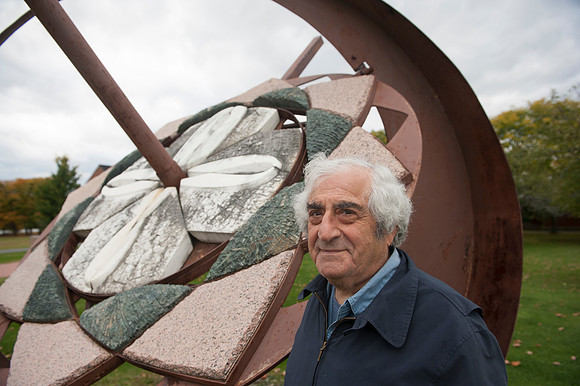 Sculptor Paul Calter with his work "Sun Disk, Moon Disk," one of three outside sculptures created for Vermont Technical College. (Herald / Bob Eddy)