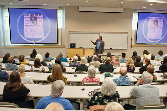 Standing Rock Sioux Tribal Chairman David Archambault II (speaking at center), of Standing Rock Tribe, lectures to a standing room only crowd in South Royalton, after the Sioux Flag raising ceremony on the campus of Vermont Law School (VLS), on Friday, May 19. The VLS chapter of the Native American Law Students Association (NALSA) honored Archambault, with an honorary degree from VLS, acknowledging his work in environmental stewardship, in leading the opposition to the Dakota Access Pipeline. (Herald / Seth Butler)